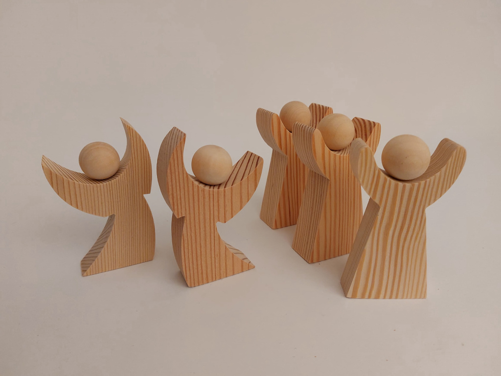 - Design: Handgefertigte, minimalistische Engel mit weichen Rundungen und einer Kugel als Kopf, die den Figuren eine elegante Schlichtheit verleiht.